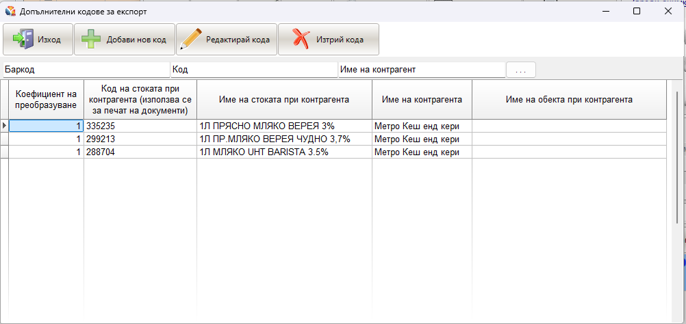 Отворете картона на стоката, натиснете бутон “Още” и след това изберете “Допълнителни кодове за експорт”. Ще се отвори следващия прозорец, където ще се видят всички кодове и фирмите, за които се отнасят. Ако имате грешно обвързан код, от тук може да изтриете обвързването. В нашия случай се вижда, че стоката е обвързана с три различни стоки от Метро, тоест тези три стоки в нашия обект се водят под името на една стока.