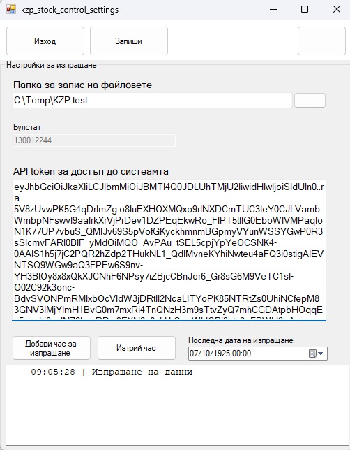 В експортния сървър трябва да поставите токена, който ще генерирате в сайта на КЗП. Посочете папката, в която да се създава справката и час в който да се изпраща.