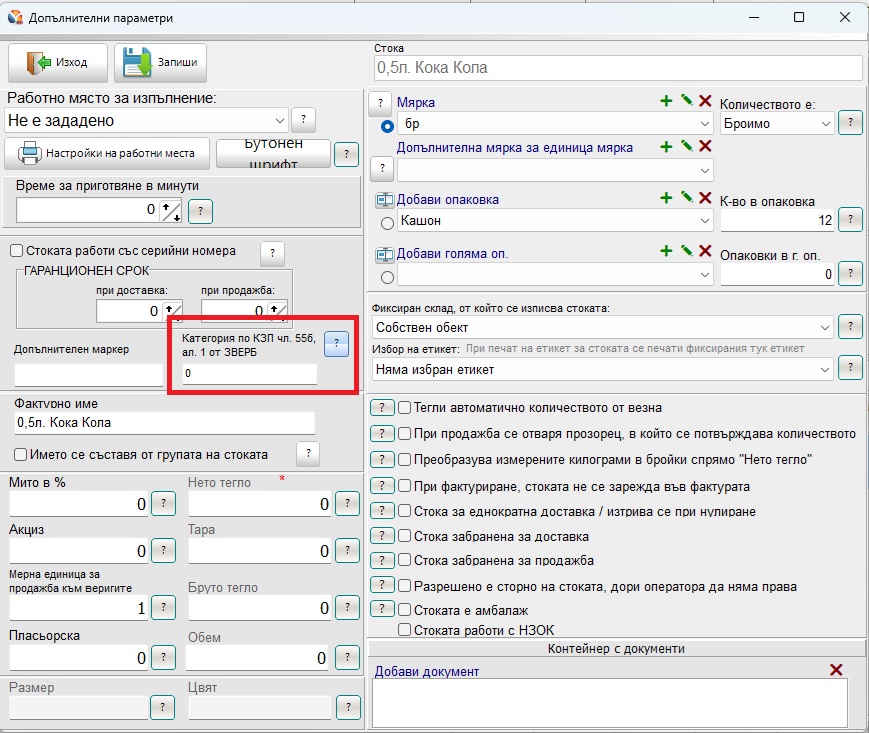 Стоки – определете кои стоки ще се изпращат. За целта в картона на стоката трябва да попълните нейния код по категория за КЗП чл. 55б ал. 1 от ЗВЕРБ. Стоките, които имат въведен код ще бъдат изпращани. Настройката се намира в картона на стоката, “Параметри”.
