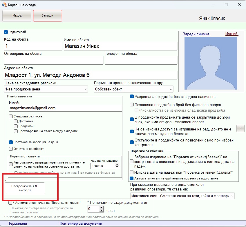 Обекти – Определете от кои обекти ще се изпраща информация – в основната конзола на програма Янак отворете раздел “Настройки” – “Глобални настройки” – “Обекти”, посочете съответния обект, за който ще изпращате информация и влезте в неговия картон. Натиснете бутон “Настройки за КЗП експорт”. В екрана трябва да посочите коя цена на стоките ще се изпраща и попълнете кода на обекта – ЕКАТТЕ код. Включете настройката “Активен експорт за този обект”.