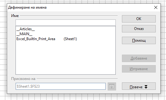 MAIN – Определя диапазона в екселския шаблон, която участва в печата