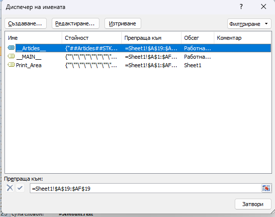 Excell – От контекстното меню изберете “Формули” -> “Ръководител на имената” и ще се отвори следващият прозорец.